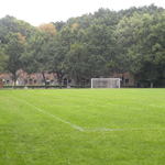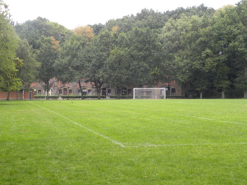 Voetbalveld in de binnenruimte van het fort, waar voorheen het centrale reduit met het aarden dek lag. De aarden dekken zijn afgegraven en hebben plaats geruimd voor sportterreinen. Op de achtergrond herkent men het hoofdfrontgebouw.