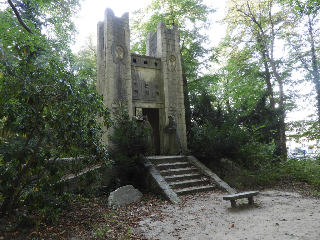 Statie 1: Simeon voorspelt het lot van Christus op de trappen van een Assyrische tempel (1946). Het tafereel verschijnt tussen de bomen en het struikgewas, wat voor een zekere beslotenheid en verrassingseffect zorgt.