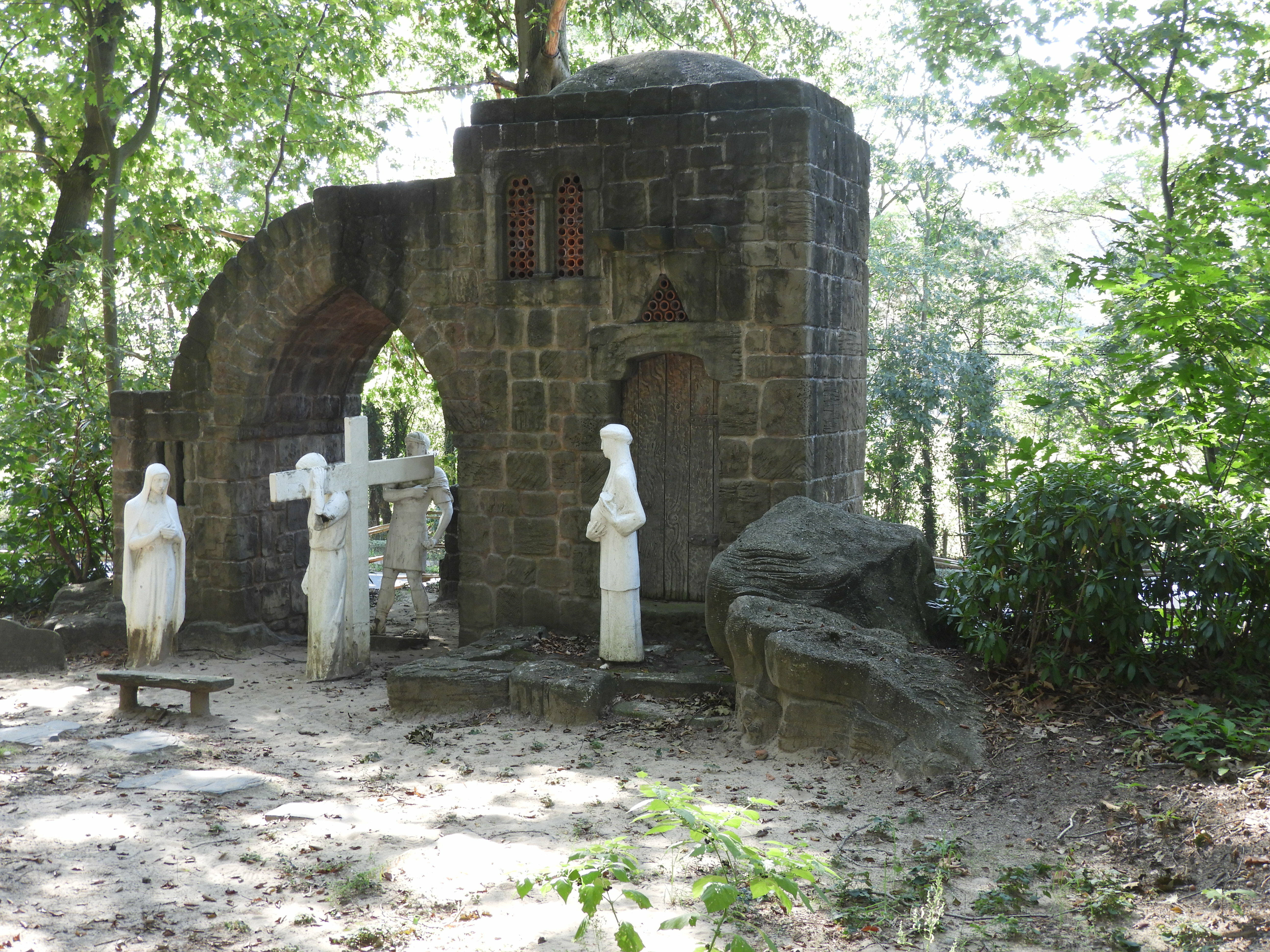 Statie 4: Ontmoeting van Maria met Jezus op weg naar de Calvarieberg Christus die kruisdragend door een gotische stadspoort met een Romaans dubbelraampje strompelt (1955)