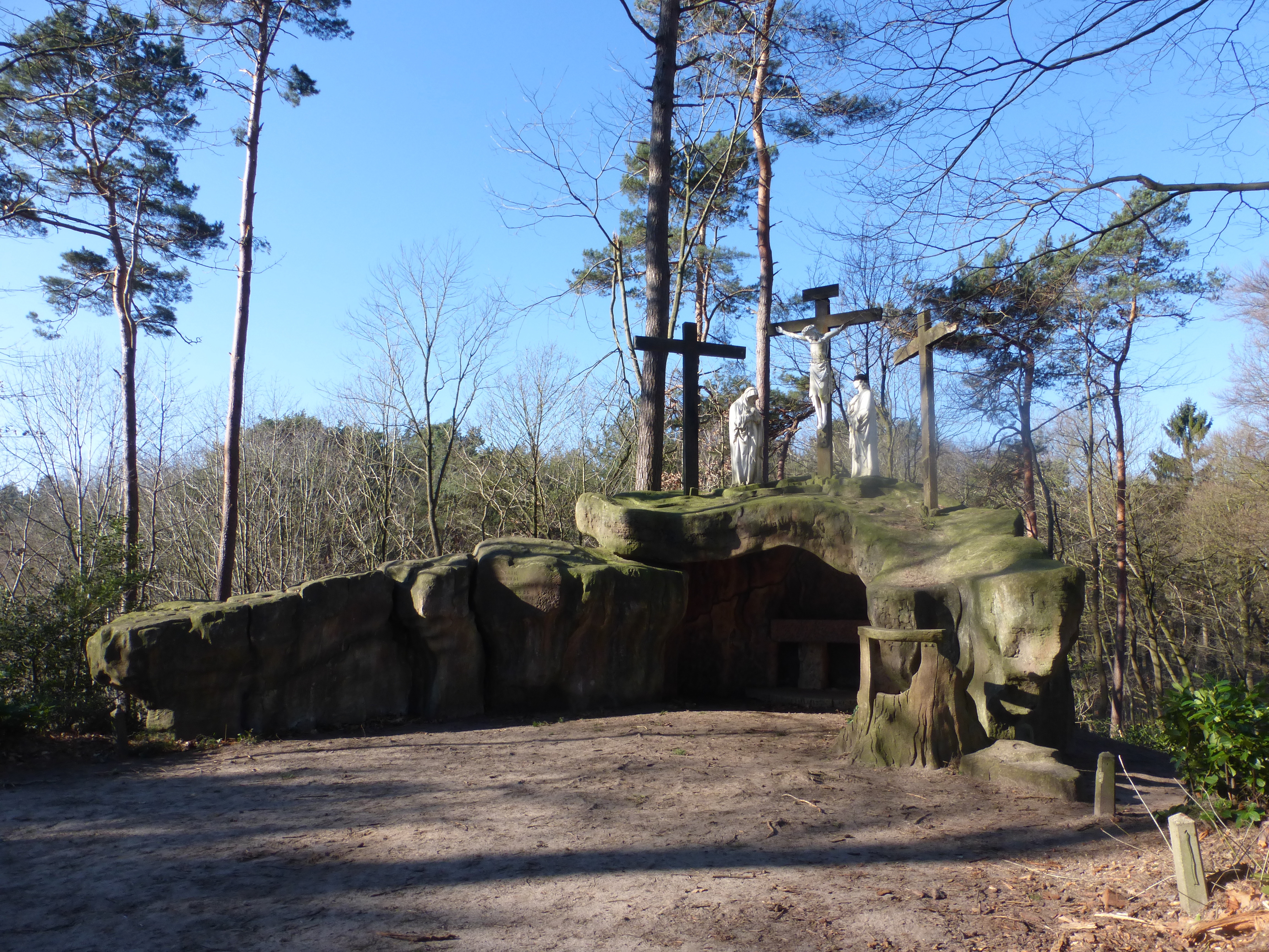 Statie 5: Calvarie, met een gekruisigde Christus boven op de berg Golgotha (1960). Het rotseerbedrijf Tondeleir voegde een preekstoel van imitatie-hout toe aan het ontwerp.