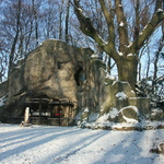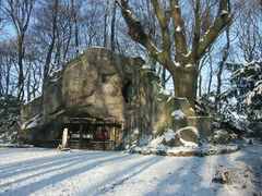 Lourdesgrot in het Mariapark bij de abdij van Averbode. Voor het hek een beeld van de knielende Bernadette Soubirous, dat inmiddels verdwenen is.