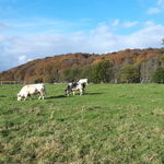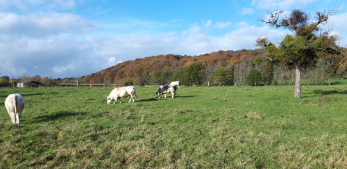 Zicht van op de Holleweg over de weilanden bij domein Hottat, met een beboste Diestiaan heuvel op de achtergrond.