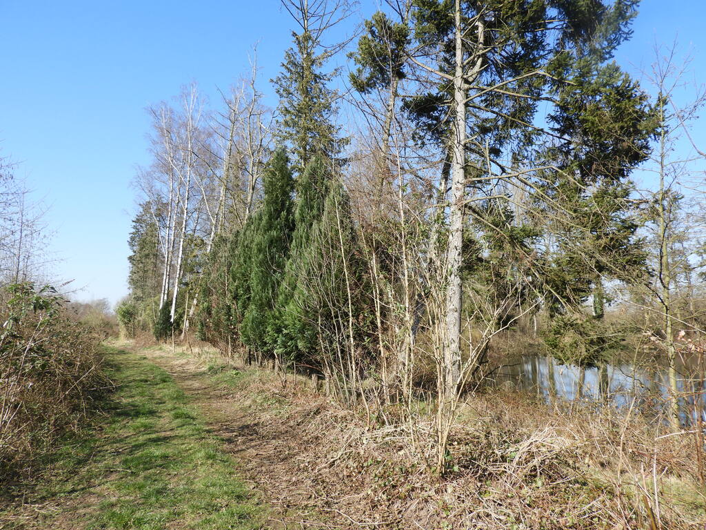 Weg langs de tussen 1962-1971 uitgegraven weekendvijvertjes in de Steenbeemden, met de typisch aangeplante vegetatie zoals thuya plicata, bamboe, naaldbomen. Dit verstoorde gebied wordt omgevormd ter versterking van de natuurwaarden.