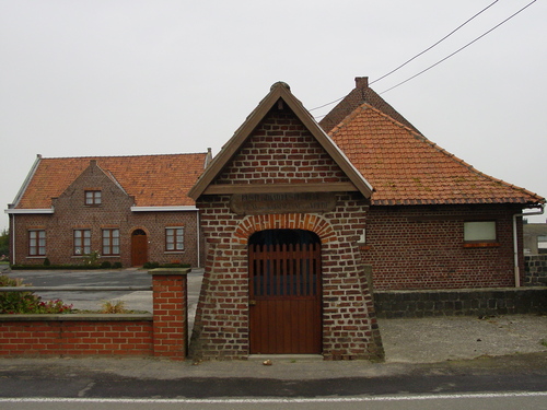 De afbeelding 'Wederopbouwhoeve met kapel' gemaakt door Decoodt, Hannelore wordt ter beschikking gesteld door Agentschap Onroerend Erfgoed (AOE) onder de volgende voorwaarden: Modellicentie voor gratis hergebruik, Naamsvermelding 4.0 Internationaal.