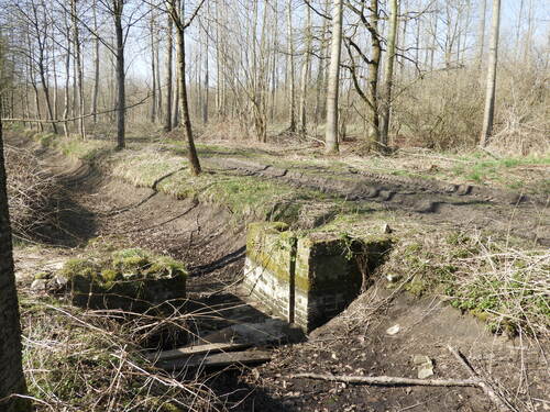 Sluisje op een afvoerkanaal van de watering. Het systeem van aan- en afvoerkanalen is ook onder bos nog goed bewaard.