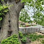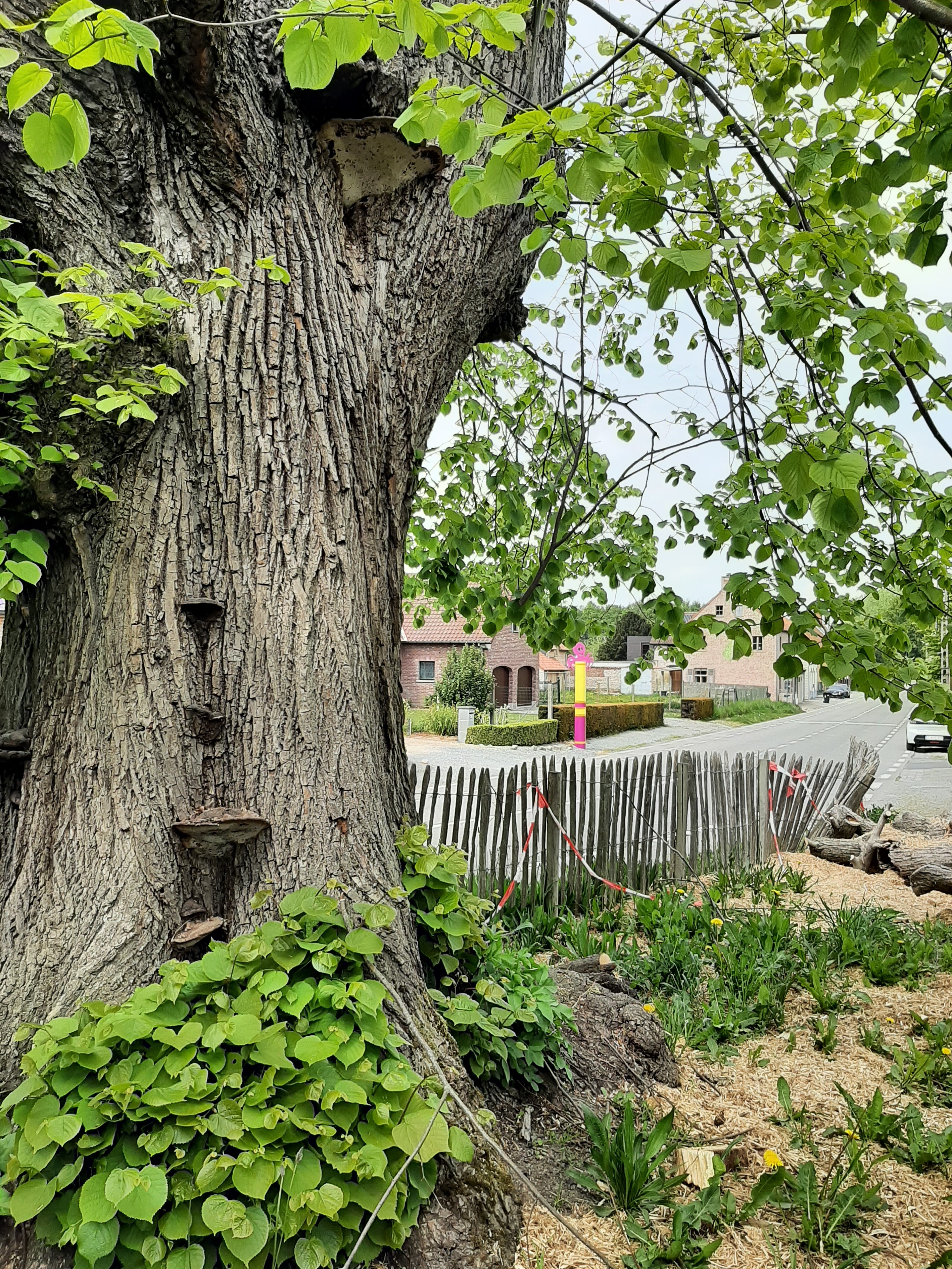 De zevensacramentenboom na de snoei in 2022. Om falen van de stam te vermijden, werd er gewicht uit de kroon gehaald. Deze snoei was een derde fase. Detail van de stamvoet, de zwammen en de standplaats.