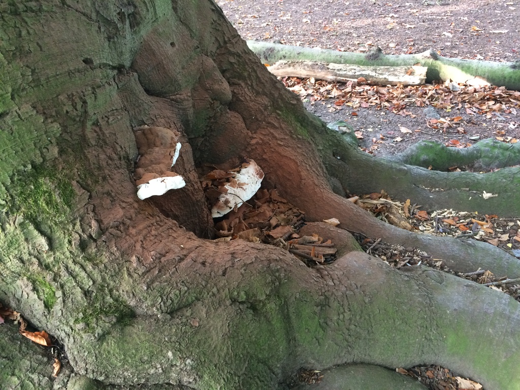 De toestand van de drievuldigheid in 2017. Detail van de stamvoet en het zwammenbeeld.