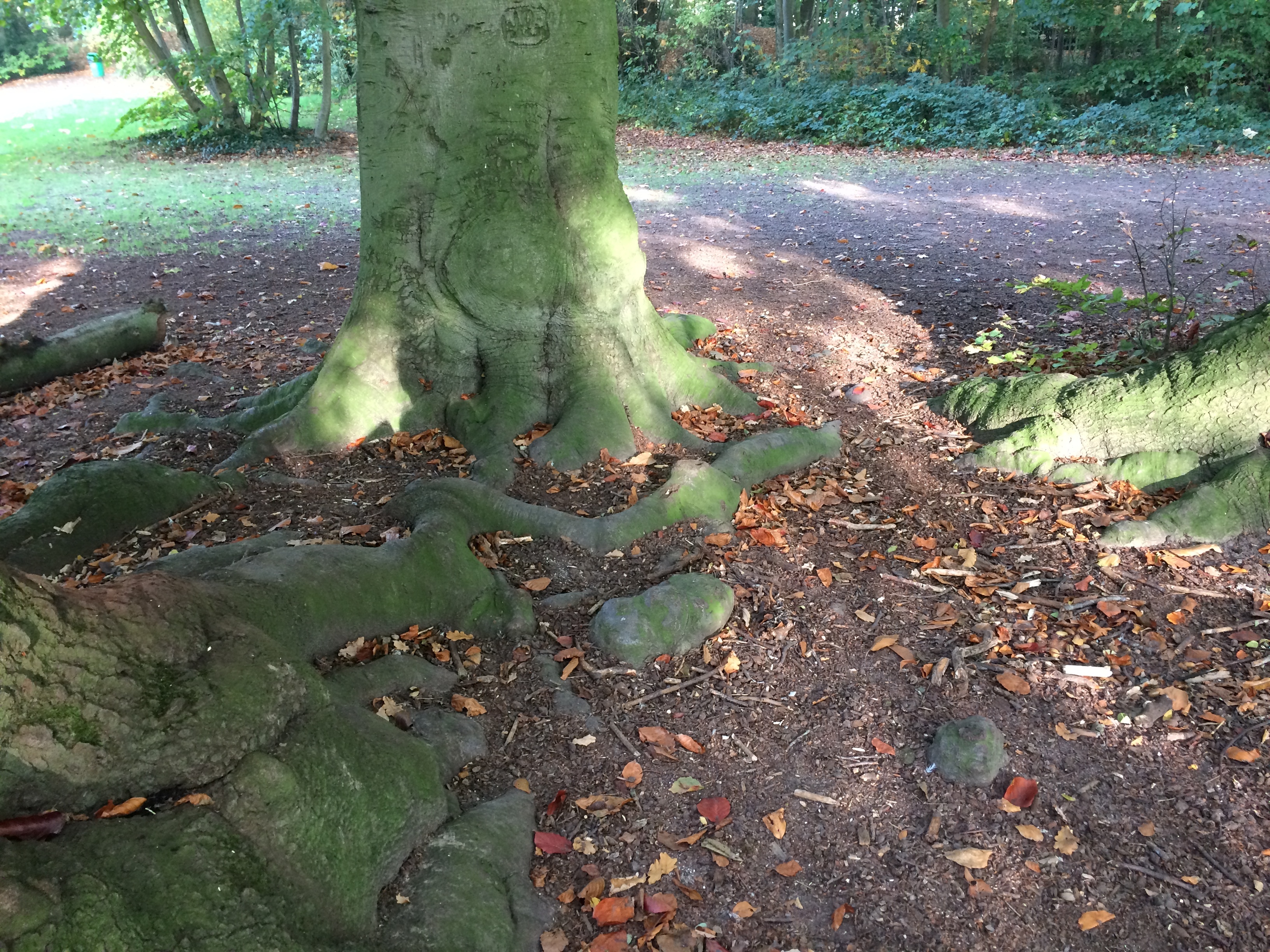 De toestand van de drievuldigheid in 2017. De wortelzone in beeld. Boomgraffiti aanwezig.