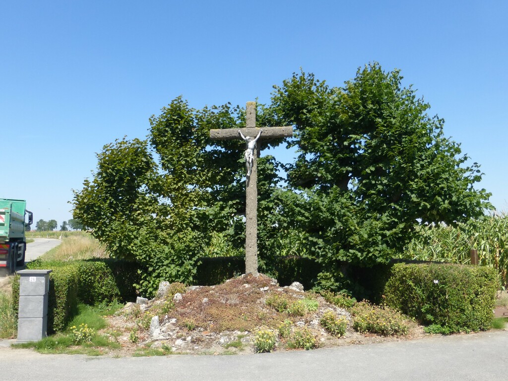 De afbeelding 'Kruis met geleide lindes' gemaakt door Vanneste, Pol wordt ter beschikking gesteld door Agentschap Onroerend Erfgoed (AOE) onder de volgende voorwaarden: Modellicentie voor gratis hergebruik, Naamsvermelding 4.0 Internationaal.