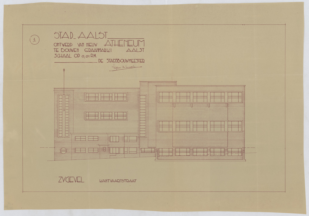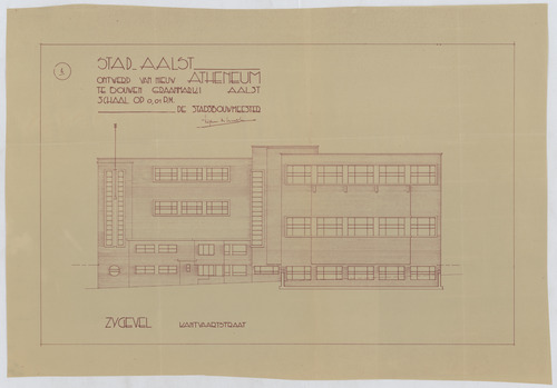 Opschrift: Stad Aalst. Ontwerp van nieuw atheneum te bouwen Graanmarkt Aalst Omschrijving plan: opstand zijgevel 1, zijgevel kant Vaartstraat Datum KCML: deze informatie wordt niet vermeld op het archiefstuk Archiefnummer: O0011