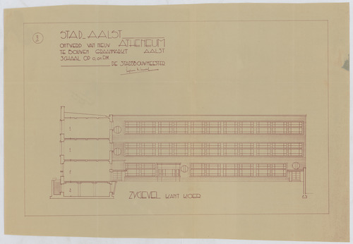 Opschrift: Stad Aalst. Ontwerp van nieuw atheneum te bouwen Graanmarkt Aalst Omschrijving plan: opstand zijgevel 2, zijgevel kant koer Datum KCML: deze informatie wordt niet vermeld op het archiefstuk Archiefnummer: O0012