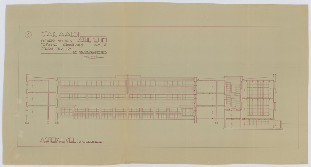 Opschrift: Stad Aalst. Ontwerp van nieuw atheneum te bouwen Graanmarkt Aalst Omschrijving plan: opstand achtergevel Datum KCML: deze informatie wordt niet vermeld op het archiefstuk Archiefnummer: O0010