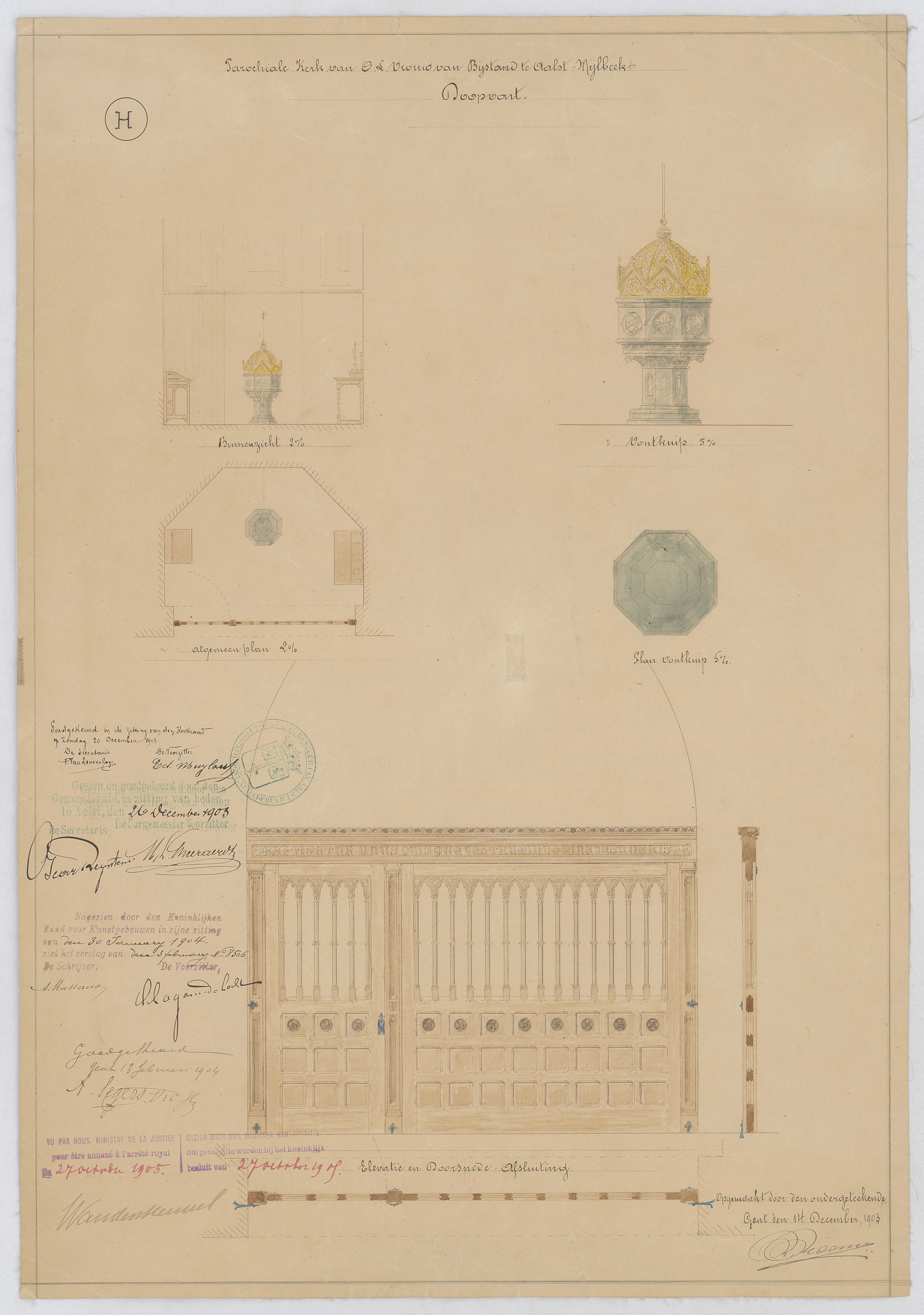 Opschrift: Parochiale kerk van O.L.Vrouw van Bijstand te Aalst Mijlbeek. Doopvont Omschrijving plan: doopvont: situatieschets, vooraanzicht en plattegrond van de doopvont; opstand en plattegrond afsluiting Datum KCML: 30/01/1904 Archiefnummer: O0033