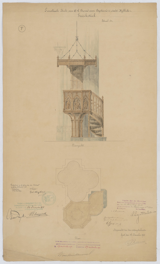 Opschrift: Parochiale kerk van O.L.Vrouw van Bijstand te Aalst Mijlbeek. Predikstoel Omschrijving plan: preekstoel: vooraanzicht en plattegrond Datum KCML: 30/01/1904 Archiefnummer: O0031