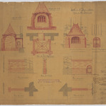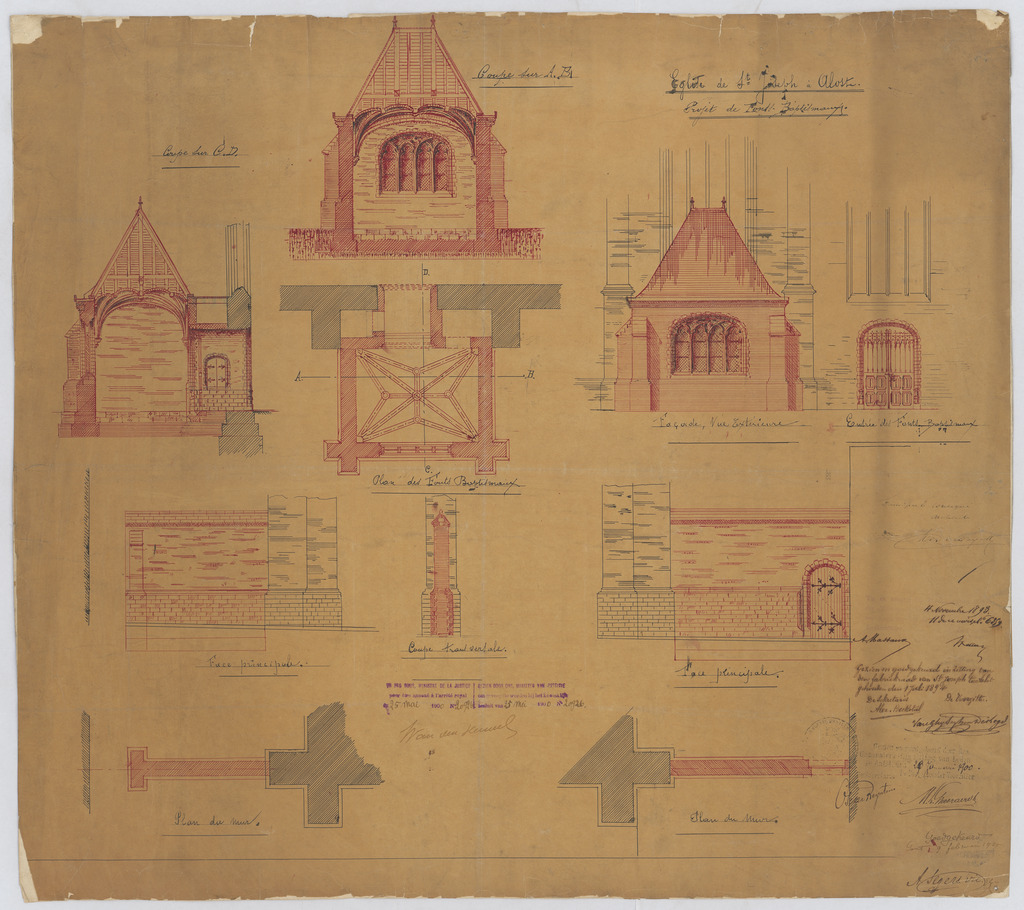 Opschrift: Eglise de St. Joseph à Alost. Projet de Fonts Baptismaux Omschrijving plan: opstanden diverse gevels, doorsnede en plattegrond Datum KCML: 04/11/1893 Archiefnummer: O0038