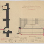 Opschrift: Provincie Oost-Vlaanderen Stad Aalst. Ontwerp tot het bouwen van een magazijn aan de Sint-Martenskerk Omschrijving plan: plattegrond niveau 0, langsdoorsnede magazijn Datum KCML: 13/10/1906 Archiefnummer: O0056