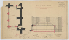 Opschrift: Provincie Oost-Vlaanderen Stad Aalst. Ontwerp tot het bouwen van een magazijn aan de Sint-Martenskerk Omschrijving plan: plattegrond niveau 0, langsdoorsnede magazijn Datum KCML: 13/10/1906 Archiefnummer: O0056