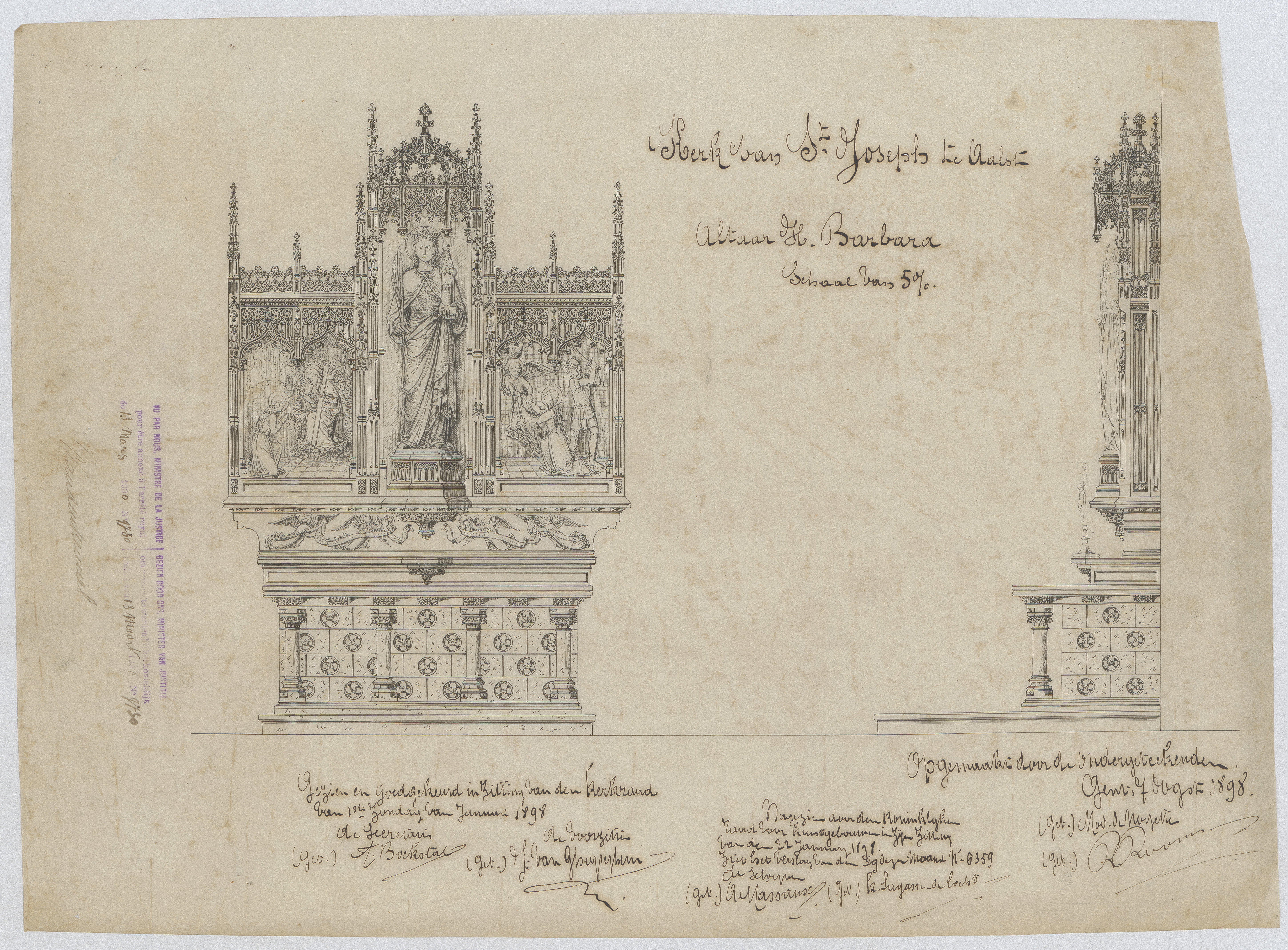 Opschrift: Kerk van St. Joseph te Aalst. Ataar H. Barbara Omschrijving plan: voor- en zijaanzicht Datum KCML: 22/01/1899 Archiefnummer: O0046