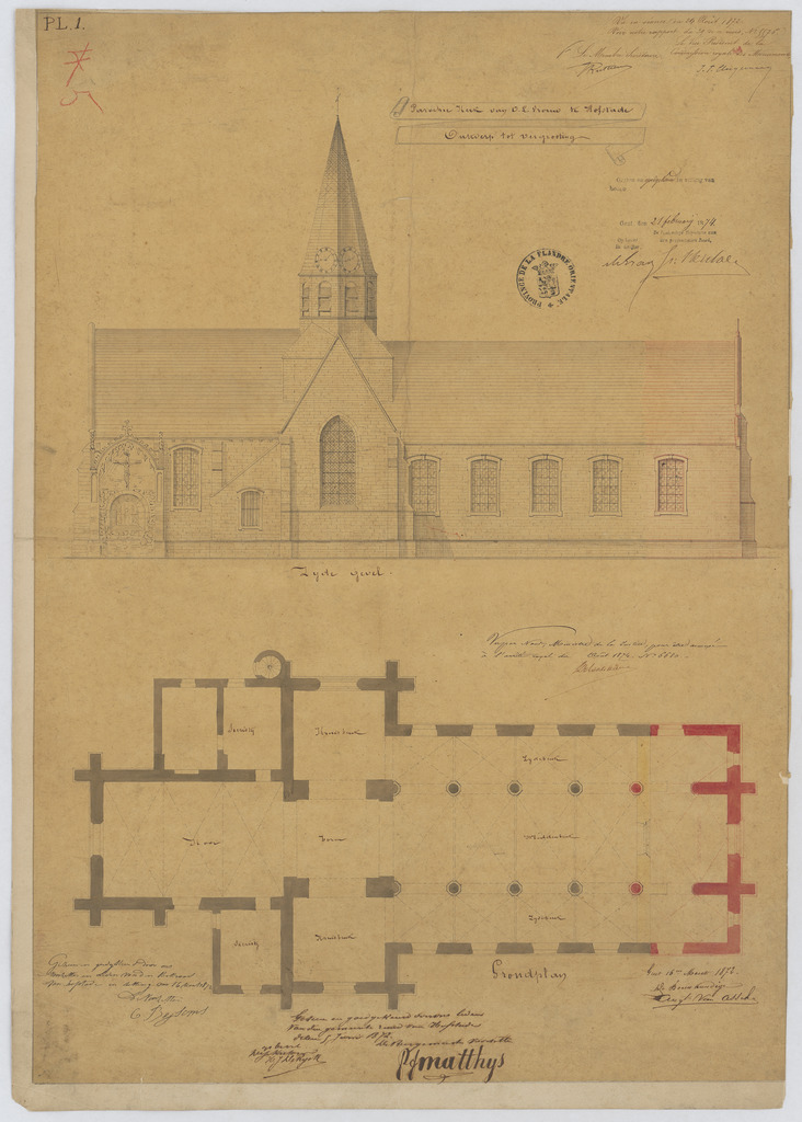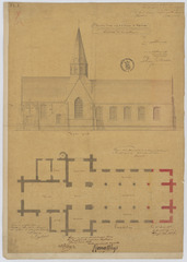 Opschrift: Parochiekerk van O.L.Vrouw te Hofstade. Ontwerp tot vergrooting. Omschrijving plan: plattegrond niveau 0, opstand zijgevel Datum KCML: 24/08/1872 Archiefnummer: O0065