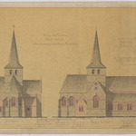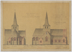 Opschrift: Provincie Oost-Vlaanderen. Gemeente Meldert. Ontwerp tot vergrooting en herstelling der parochiekerk. Omschrijving plan: opstand achtergevel, opstand zijgevel noord Datum KCML: 15/06/1889 Archiefnummer: O0074