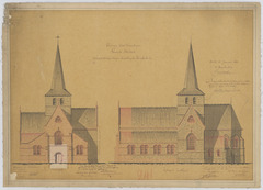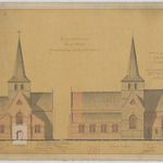 Opschrift: Provincie Oost-Vlaanderen. Gemeente Meldert. Ontwerp tot vergrooting en herstelling der parochiekerk. Omschrijving plan: opstand voorgevel, opstand zuidelijke zijgevel (aangepast ontwerp) Datum KCML: 15/06/1889 Archiefnummer: O0073_01