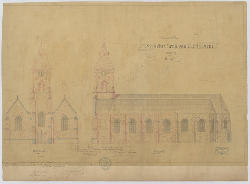 Opschrift: Gemeente Bellem. Parochiekerk van O.L.Vrouw. Ontwerp van herstelling. Omschrijving plan: opstand voorgevel, opstand zijgevel Datum KCML: 11/10/1878 Archiefnummer: O0100