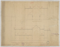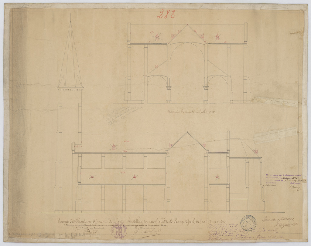Opschrift: Provincie Oost-Vlaanderen. Gemeente Bouchaute. Herstelling der parochiale kerk. Omschrijving plan: opstand zijgevel 1, dwarsdoorsnede Datum KCML: 2 /11/1895 Archiefnummer: O0140