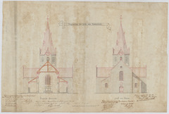 Opschrift: Vergrooting der Kerk van Lootenhulle Omschrijving plan: opstand voorgevel, dwarsdoorsnede Datum KCML: deze informatie wordt niet vermeld op het archiefstuk Archiefnummer: O0111
