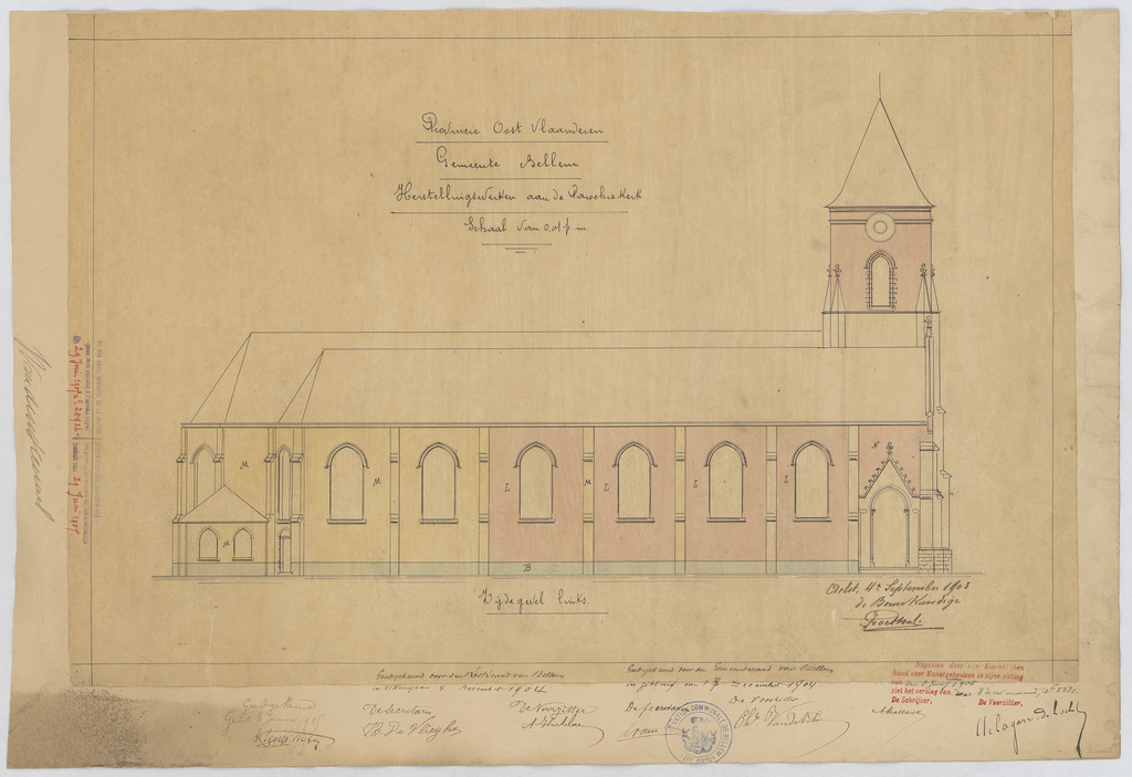 Opschrift: Herstellingswerken aan de Parochiekerk. Omschrijving plan: opstand zijgevel 1, zijgevel links Datum KCML: 3-6-1905 Archiefnummer: O0106