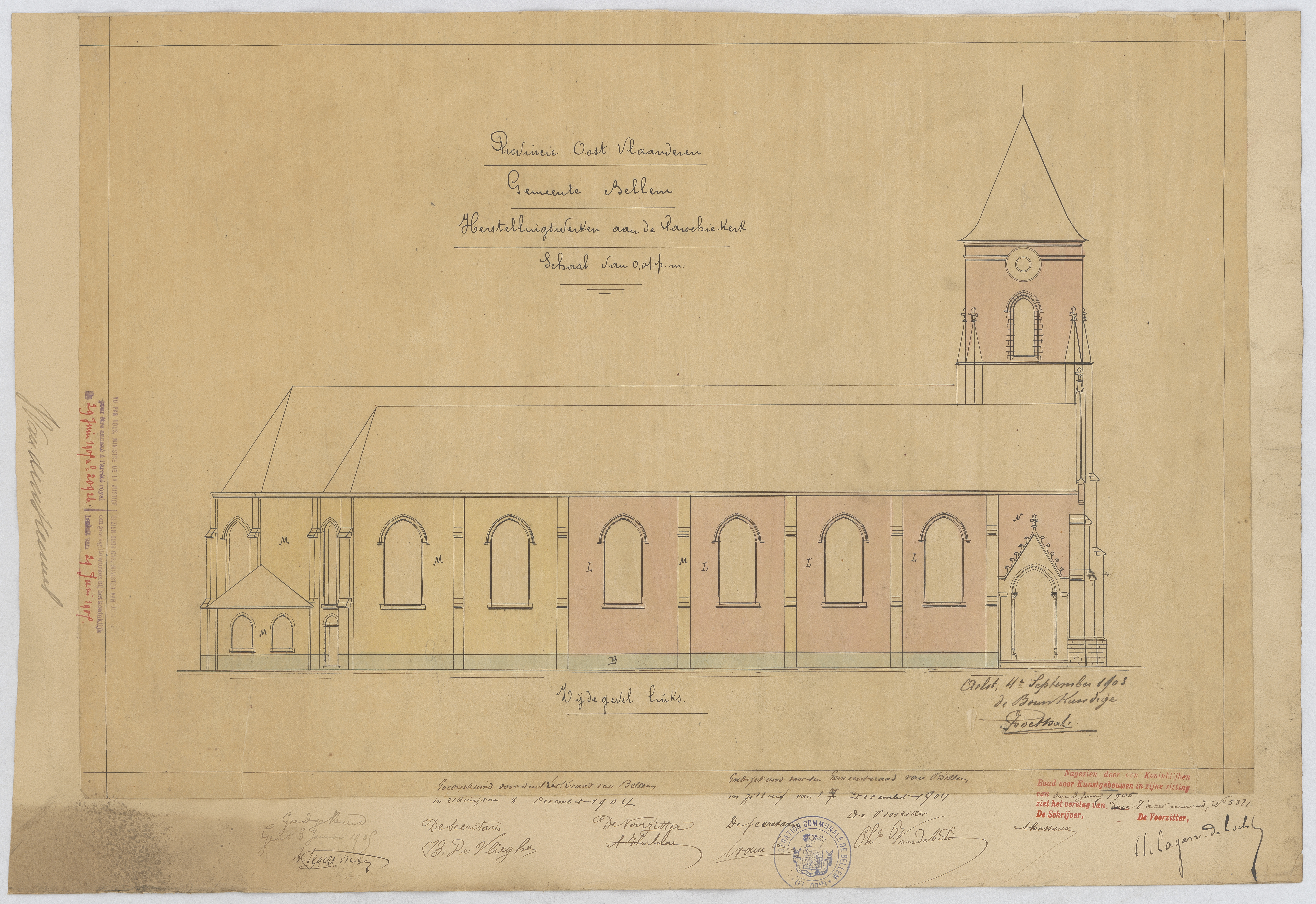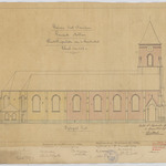 Opschrift: Herstellingswerken aan de Parochiekerk. Omschrijving plan: opstand zijgevel 1, zijgevel links Datum KCML: 3-6-1905 Archiefnummer: O0106