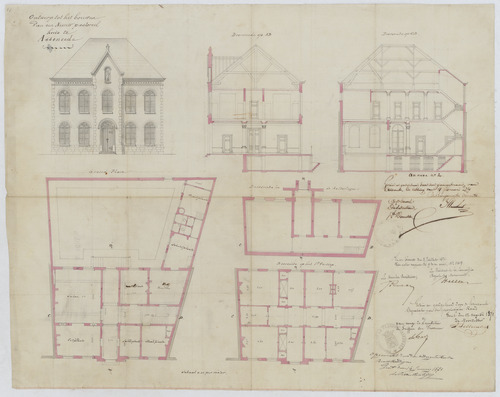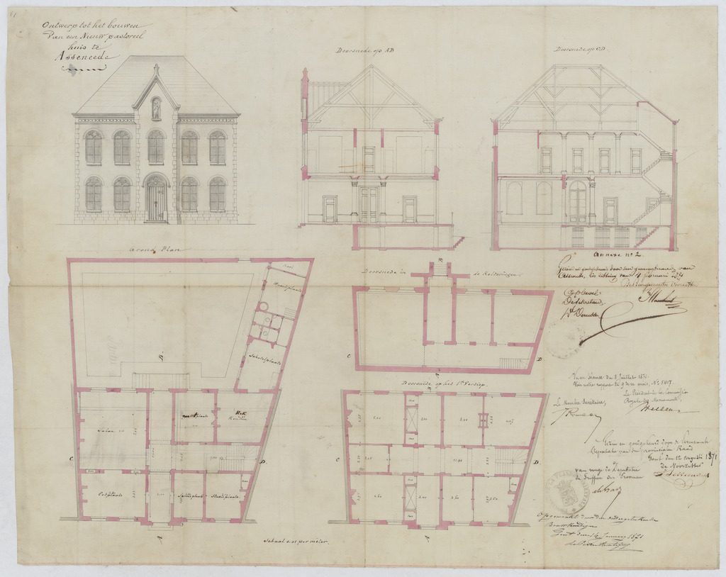 Opschrift: Ontwerp tot het bouwen van een nieuw pastoreel huis te Assenede Omschrijving plan: opstand voorgevel, plattegronden niveau -1, 0 en 1, doorsneden op A-B en C-D Datum KCML: 08/07/1871 Archiefnummer: O0128