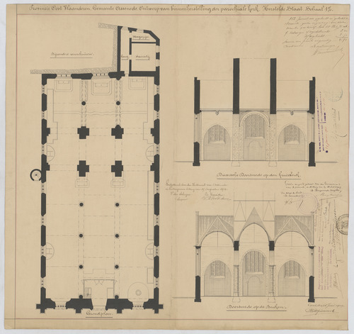 Opschrift: Provincie Oost-Vlaanderen Gemeente Assenede. Ontwerp van binnenherstelling der parochiale kerk. Herstelde staat. Omschrijving plan: plattegrond niveau 0, dwarsdoorsneden op de kruisbeuk en op de beuken Datum KCML: 27/07/1912 Archiefnummer: O0126