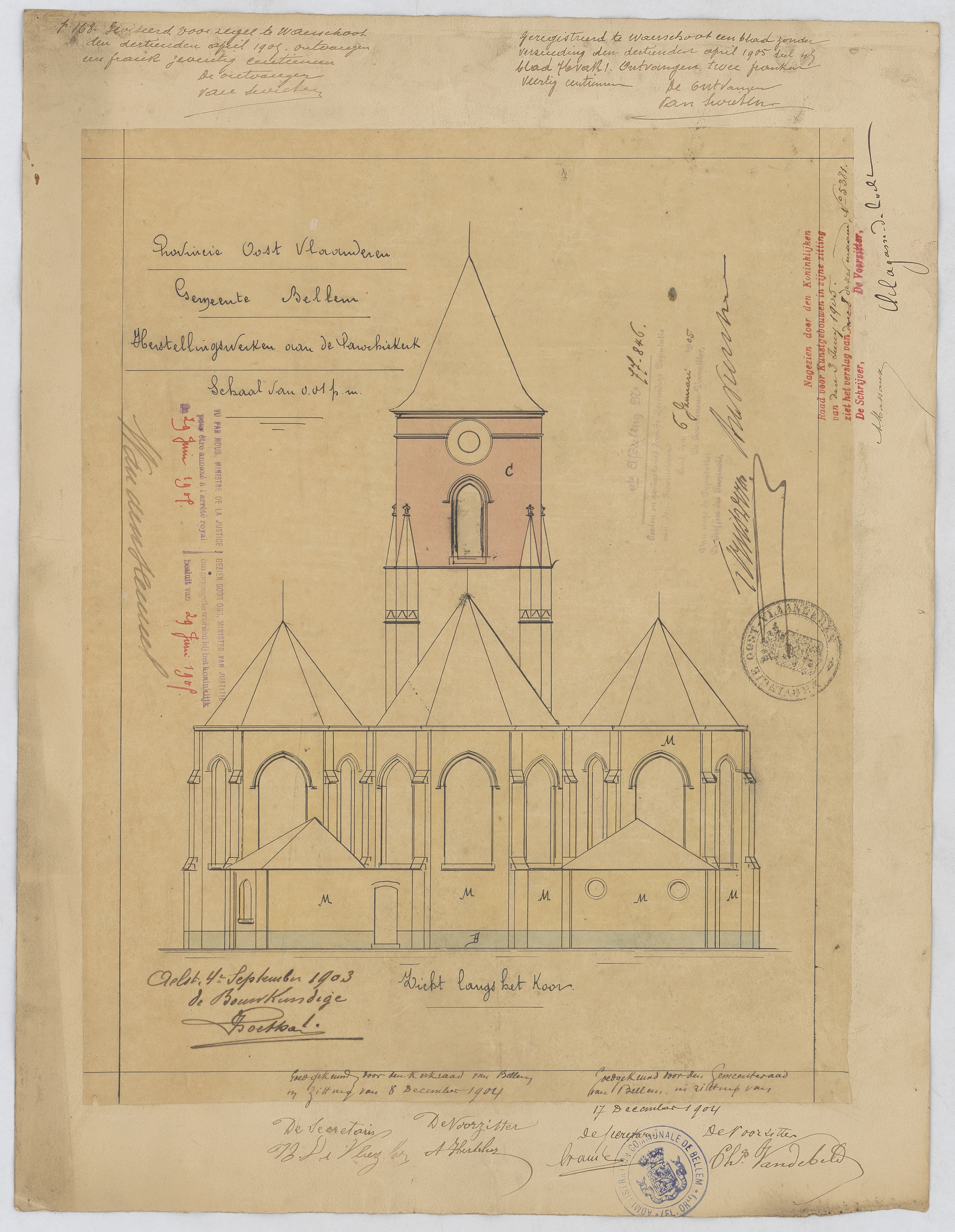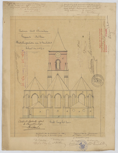 Opschrift: Herstellingswerken aan de Parochiekerk. Omschrijving plan: opstand achtergevel Datum KCML: 3-6-1905 Archiefnummer: O0105