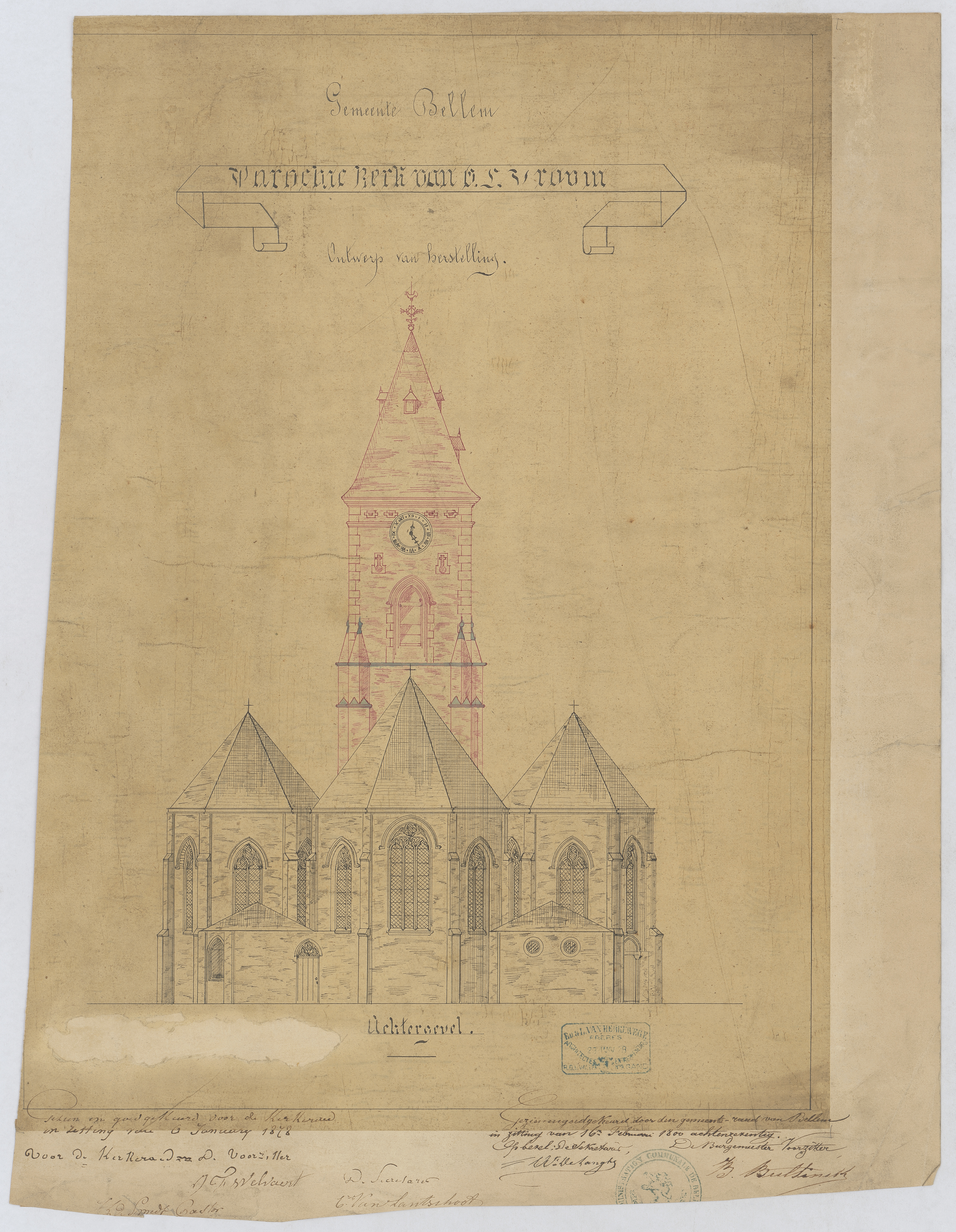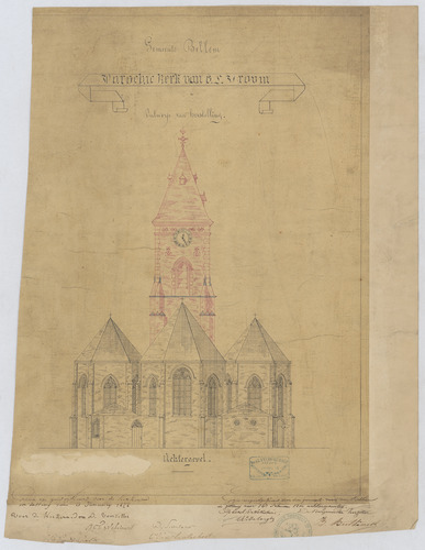 Opschrift: Gemeente Bellem. Parochiekerk van O.L.Vrouw. Ontwerp van herstelling Omschrijving plan: opstand achtergevel Datum KCML: 11/10/1878 Archiefnummer: O0101