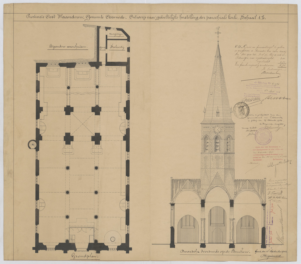 Opschrift: Provincie Oost-Vlaanderen. Gemeente Assenede. Ontwerp van gedeeltelijke herstelling de parochiale kerk. Omschrijving plan: plattegrond niveau 0, dwarsdoorsnede op de beuken Datum KCML: 21/10/1905 Archiefnummer: O0123