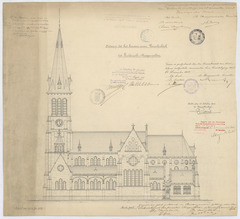 Opschrift: Ontwerp tot het bouwen eener parochiekerk tot Kieldrecht-Prosperpolder Omschrijving plan: opstand Z-gevel Datum KCML: 15-5-1909 Archiefnummer: O0196
