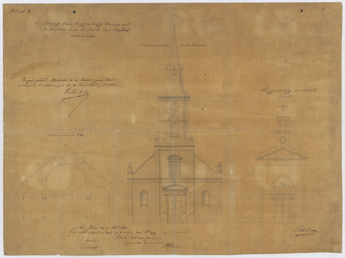 Opschrift: Ontwerp van vergrootingswerken uit te voeren aan de Kerk van Calloo Omschrijving plan: opstand voorgevel huidige en toekomstige staat, dwarsdoorsnede op C-D Datum KCML: 07/09/1861 Archiefnummer: O0192