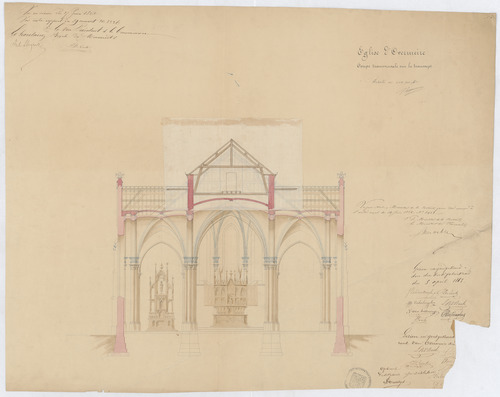 Opschrift: Eglise d'Overmeire. Coupe transversale sur le transept. Omschrijving plan: dwarsdoorsnede, dwarsdoorsnede op het transept (aangepast ontwerp) Datum KCML: 27/06/1863 Archiefnummer: O0151_01