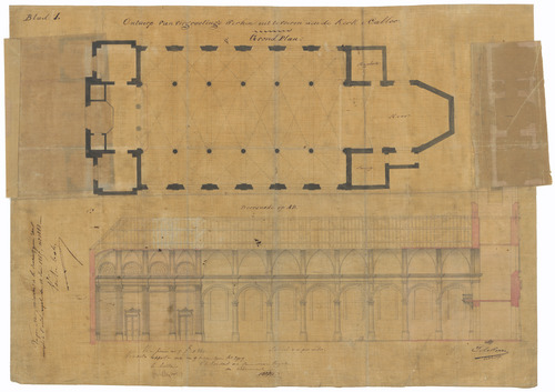Opschrift: Ontwerp van vergrootingswerken uit te voeren aan de Kerk van Calloo Omschrijving plan: plattegrond en langsdoorsnede Datum KCML: 07/09/1861 Archiefnummer: O0191_02