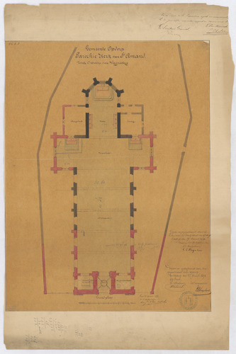 Opschrift: Gemeente Opdorp. Parochiekerk van St-Amand. Tweede ontwerp tot vergrooting. Omschrijving plan: plattegrond niveau 0 Datum KCML: 20/06/1874 Archiefnummer: O0235