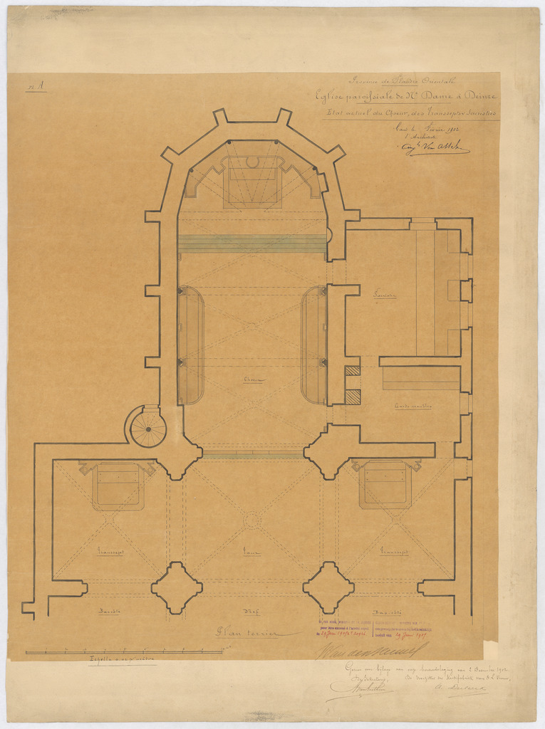 Opschrift: Province de Flandre Orientale. Eglise paroissiale de N.Dame à Deinze. Etat actuel du choeur, des transepts & sacristies. Omschrijving plan: plattegrond niveau 0, Huidige staat van het koor, de transepten en de sacristie Datum KCML: deze informatie wordt niet vermeld op het archiefstuk Archiefnummer: O0268