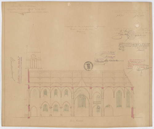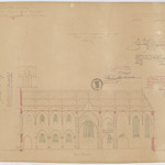 Opschrift: Provincie Oost-Vlaanderen. Gemeente Buggenhout, nieuwe parochie Opstal. Ontwerp der nieuw op te richten kerk. Omschrijving plan: langsdoorsnede Datum KCML: 13-10-1906 Archiefnummer: O0224