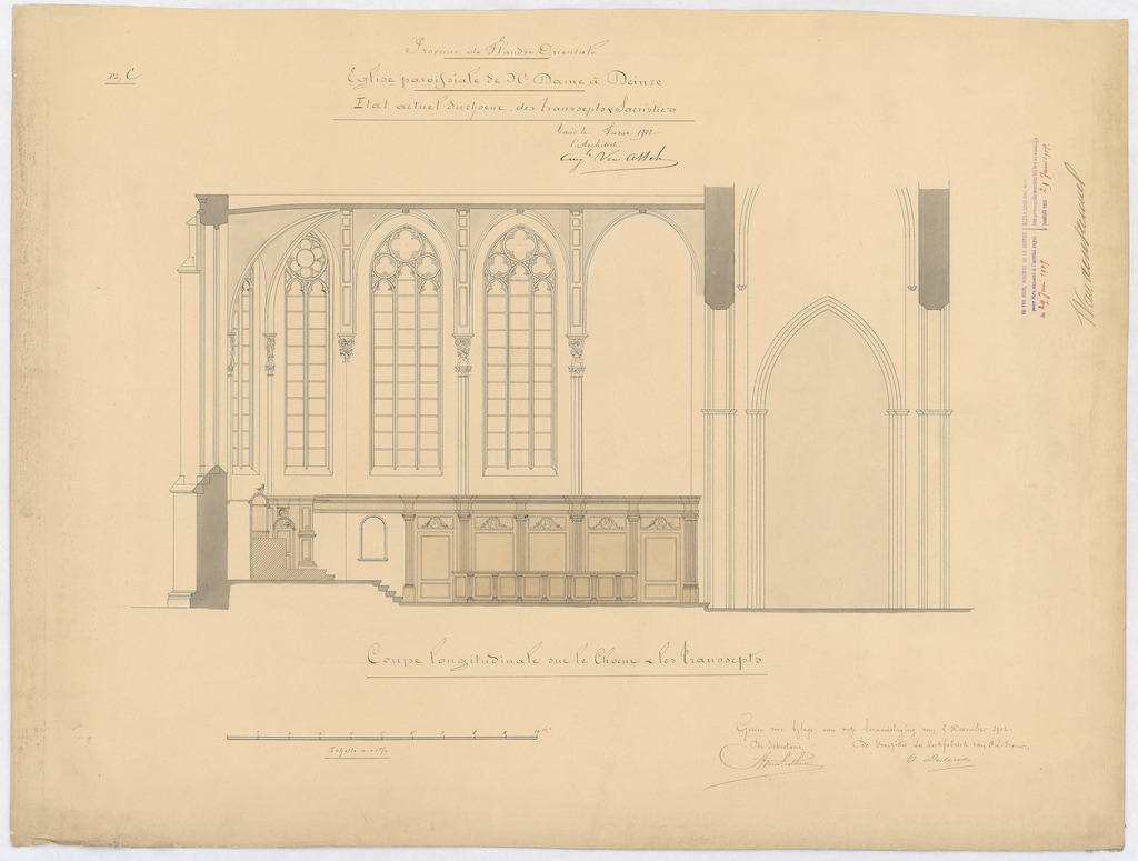 Opschrift: Province de Flandre Orientale. Eglise paroissiale de N.Dame à Deinze. Etat actuel du choeur, des transepts & sacristies. Omschrijving plan: langsdoorsnede, langsdoorsnede op het koor en de transepten Datum KCML: deze informatie wordt niet vermeld op het archiefstuk Archiefnummer: O0274