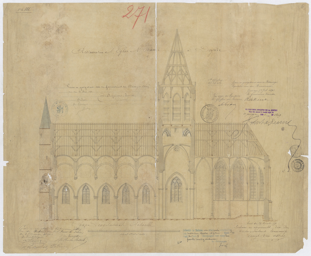 Opschrift: Restauration de l'Eglise N.Dame à Deynze Omschrijving plan: langsdoorsnede Datum KCML: deze informatie wordt niet vermeld op het archiefstuk Archiefnummer: O0263