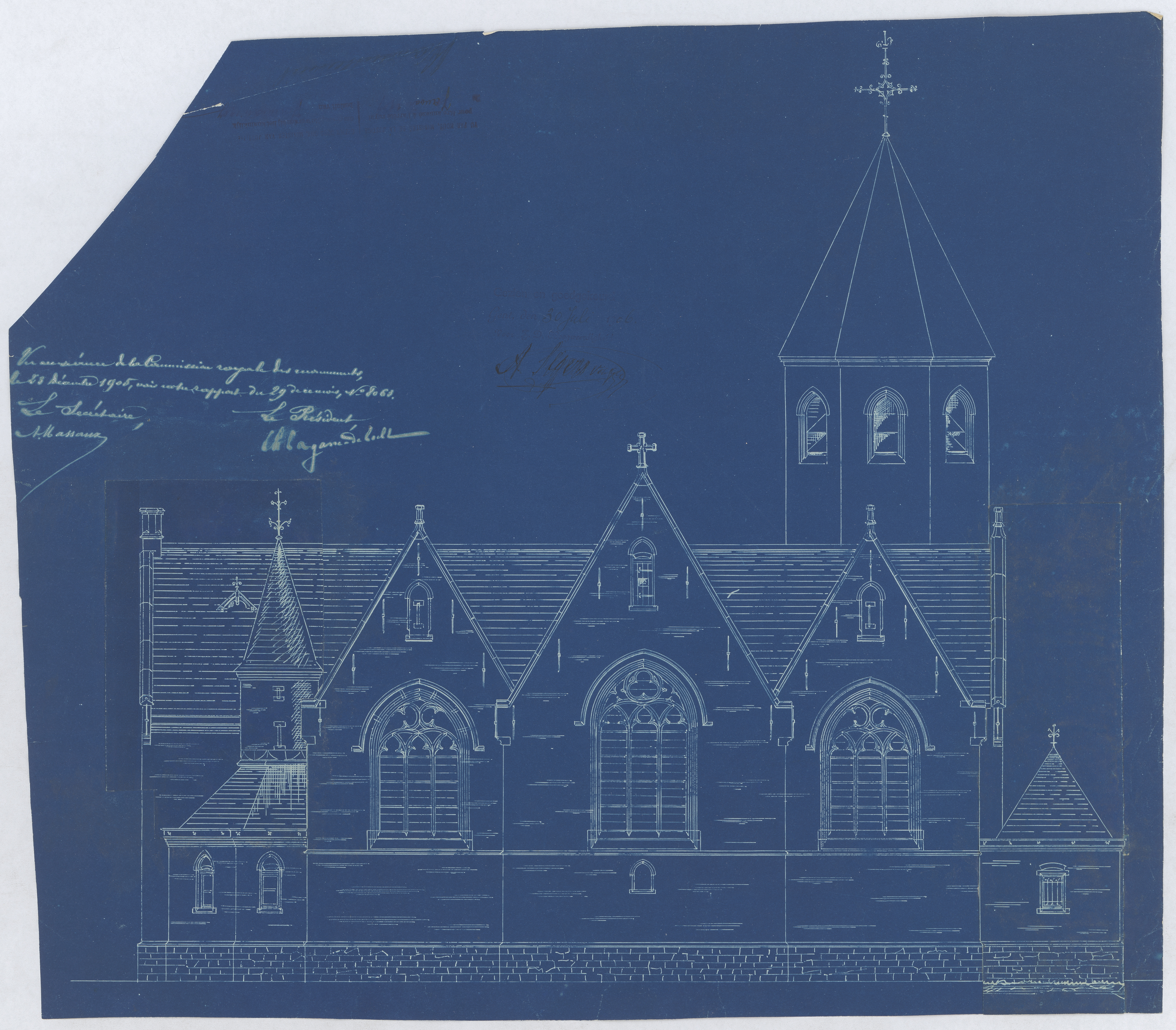 Opschrift: Gemeente Grammene. Provincie Oost-Vlaanderen. Ontwerp voor het bouwen eener Nieuwe Kerk met behoud van ouden toren. Omschrijving plan: opstand achtergevel Datum KCML: 23-12-1905 Archiefnummer: O0289
