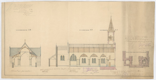 Opschrift: Ontwerp voor de herstelling en vergrooting der parochiale kerk der gemeente Meyghem canton Nevele Omschrijving plan: plattegrond niveau -1, dwarsdoorsnede A-B, langsdoorsnede C-D Datum KCML: 26/06/1897 Archiefnummer: O0300
