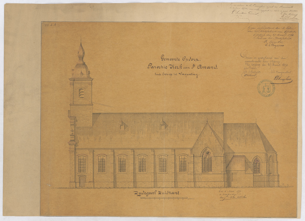 Opschrift: Gemeente Opdorp. Parochiekerk van St-Amand. Tweede ontwerp tot vergrooting. Omschrijving plan: opstand Z-gevel Datum KCML: 20/06/1874 Archiefnummer: O0237