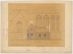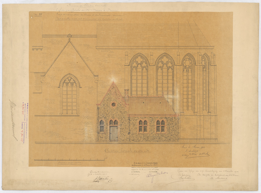 Opschrift: Province de Flandre Orientale. Eglise paroissiale de N.Dame à Deinze. Projet de restauration du choeur et des transepts. Nouveau dépôt de meubles du côté nord et restauration des sacristies du côté sud. Omschrijving plan: opstand Z-gevel Datum KCML: 22-8-1903 Archiefnummer: O0273