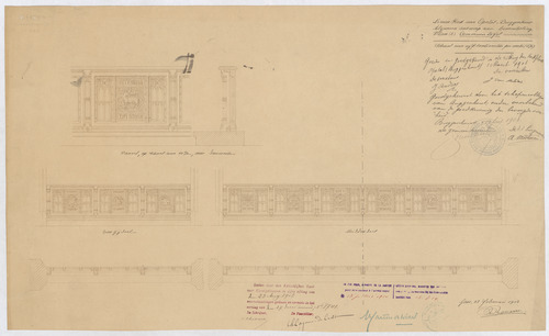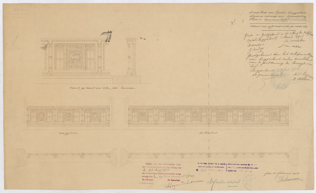 Opschrift: Nieuwe kerk van Opstal-Buggenhout. Algemeen ontwerp van bemeubeling. Communietafel Omschrijving plan: voor- en zijaanzicht en plattegrond Datum KCML: 23-5-1908 Archiefnummer: O0229