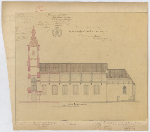 Opschrift: Province de la Flandre Orientale. Eglise Paroissiale de St.Amand à Opdorp. Projet d'agrandissement. Omschrijving plan: langsdoorsnede Datum KCML: 05/02/1881 Archiefnummer: O0243